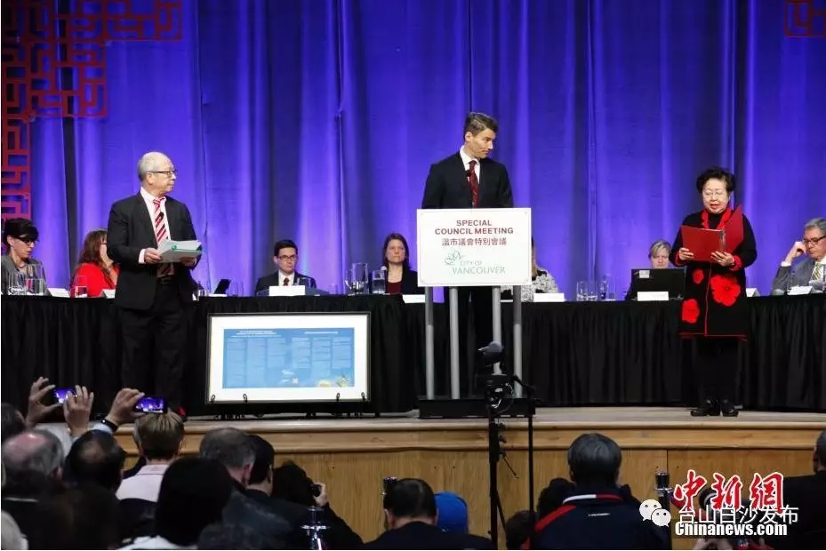 2018422日下午,加拿大温哥华市市议会在位于唐人街的大温哥华中华文化中心举行特别会议,市长罗品信(Gregor Robertson)代表市府就该市歧视华人的历史向华人社区正式道歉。图为罗品信(中)与温哥华原华裔市议员叶吴美琪(右)、余宏荣(左)分别用英语和中文广府方言、四邑方言宣读道歉内容。