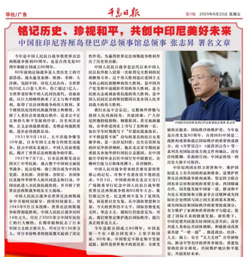 2025年8月22日,驻登巴萨总领事张志昇分别在印度尼西亚安塔拉通讯社巴厘省、西努沙登加拉省和东努沙登加拉省分社网站以及《千岛日报》《讯报》和《国际日报》等中文报刊发表题为《铭记历史 珍爱和平 共创中印尼美好未来》的署名文章,纪念中国人民抗日战争暨世界反法西斯战争胜利80周年。全文如下:
