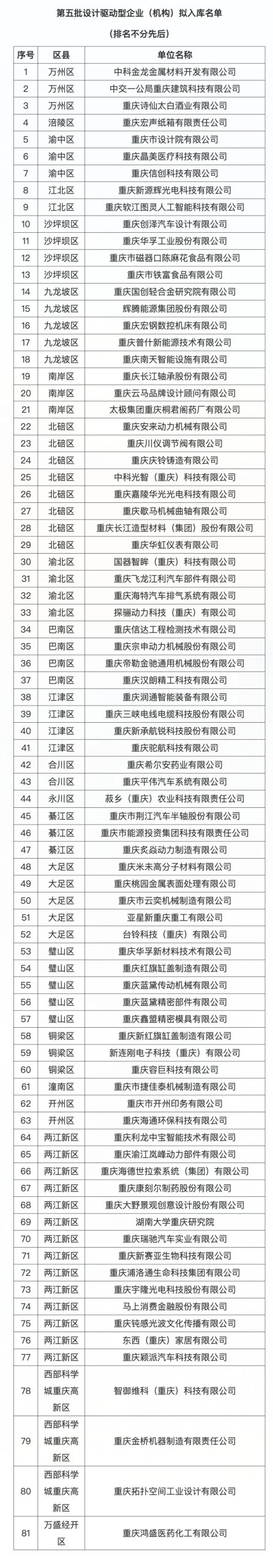 8月26日,重庆市经济和信息化委员会公示了第五批设计驱动型企业(机构)拟入库名单,共有81家企业(机构)入选。