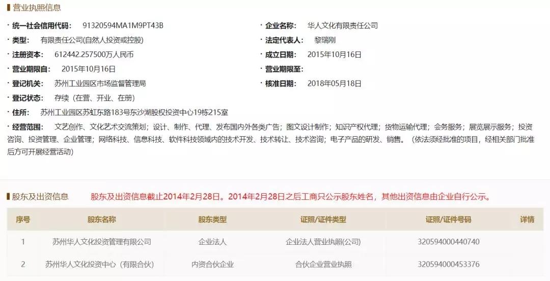 黎瑞刚的左手是华人文化集团公司。工商资料显示,其运营主体为华人文化有限责任公司,成立于2015年10月,法定代表人黎瑞刚,注册资本61.24亿元,股东为苏州华人文化投资中心(有限合伙)、苏州华人文化投资管理有限公司,二者持股比例为99.99%和0.01%。