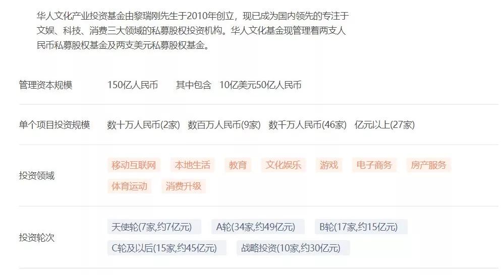 IT桔子的数据显示,目前华人文化产业基金管理资金规模是150亿,包括两支人民币基金及两支美元基金,主投文娱、科技和消费三大领域。由黎瑞刚任董事长,徐志豪任总裁。