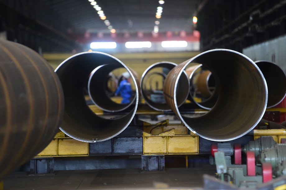 一批大口径钢管产品下线。新华网发(郑强 摄)
