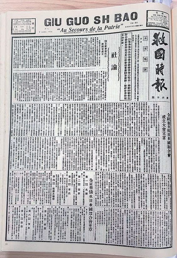在所有当时出版的各类抗战报刊中,以《救国时报》影响最大。《救国时报》,广泛传播中国共产党关于抗日救国的一系列正义主张,超越党派政治而弘扬抗日爱国主旋律,在全欧乃至全世界都产生了重要影响。《救国时报》原名《救国报》,1935年5月15日,《救国报》正式获准在巴黎注册出版发行。由于法国当局查封,1935年12月9日,更名《救国时报》后出版发行,吴玉章任发行人兼主编,为该报工作的人员几乎全是洋溢着满腔爱国热情的留法学生。