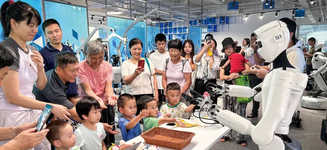 2025年7月28日,参观者在机器人6S店与机器人互动。当日,全球首家机器人6S店在深圳市龙岗区的机器人剧场开业,该店整合了销售、零配件、售后服务、信息反馈、租赁、个性化定制六大功能,为机器人从实验室走向市场、从技术概念走向生活场景搭建了桥梁。图/新华