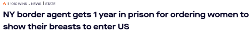 据1010WINS 8月27日报道 据检方称,周三,一名在纽约州北部的美国边境巡逻人员因要求入境美国的女性给他看胸部而认罪,被判入狱一年。