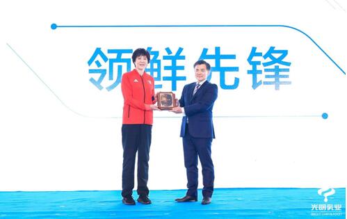 发布会现场,中国女排总教练郎平女士重磅登场,濮韶华董事长向郎导授予领鲜先锋称号。郎导表示,今后她将会把领鲜精神和女排精神融合,把光明乳业的领鲜力量带给更多消费者。