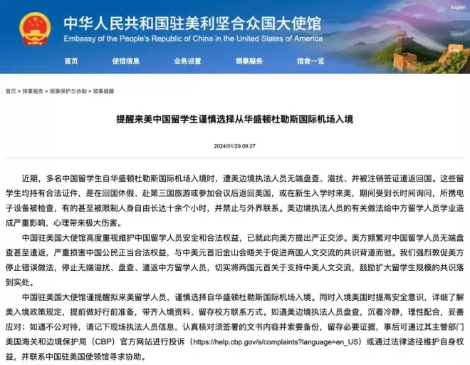 除了加拿大人,中国留学生也成了高风险群体。最近中国驻美大使馆专门发通知,提醒留学生别轻易选择休斯顿航线,因为有人在休斯顿机场遭遇严苛检查,不仅手机被翻,还被限制自由长达80小时,最后甚至被遣返。对这些年轻学生来说,这种打击不仅是心理创伤,还可能直接毁掉他们的学业。