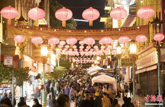 当地时间2023年11月10日,美国旧金山唐人街夜市人头攒动。亚太经合组织(APEC)第三十次领导人非正式会议在旧金山举行,当地唐人街举办包括夜市在内的多场活动,以吸引与会者、游客和市民的光顾。刘关关 摄