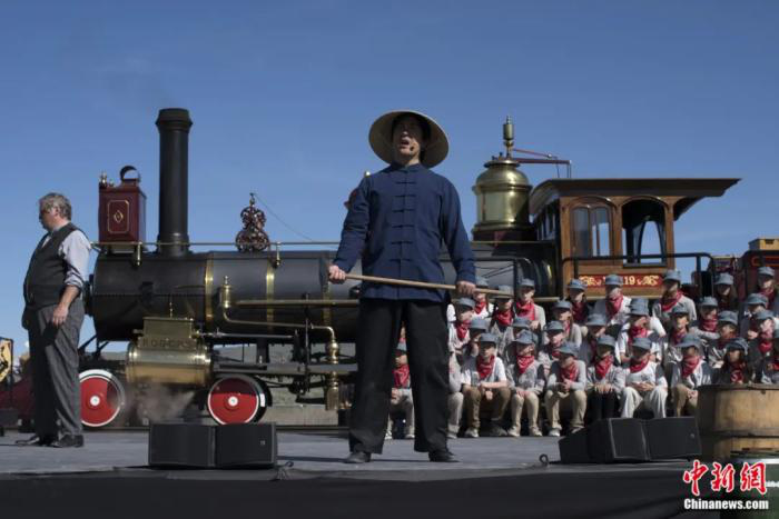 2019年5月10日,纪念太平洋铁路接轨150周年的“金钉节”在美国盐湖城举办,在150年前铁路接轨的地方纪念这一历史时刻。主办方在多个环节向铁路华工表达敬意。图为打扮成铁路华工的演员在舞台上表演。刘关关 摄