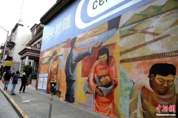 2012年,美国旧金山唐人街,地铁工地外竖起反映华人移民美国历史的壁画。陈钢 摄