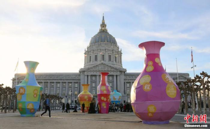 2017年1月,美国旧金山市政府广场,以华人姓氏为主题的装置艺术作品“岁岁平安”揭幕,庆祝中国农历新年。刘丹 摄