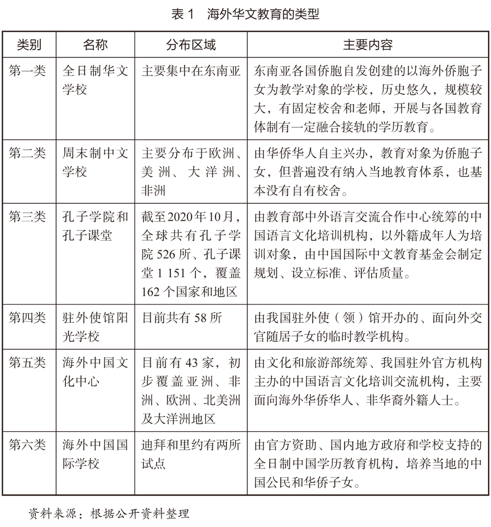 经过上百年的发展,海外华文教育逐渐形成了全日制华文学校、周末制中文学校等六类教育机构,如表1所示。与世界主要大国相比,中国海外国际学校的建设几近空白。2020年9月,中国才在迪拜试点建立了海外第一所全日制中国特色的国际学校。而美英等西方发达国家近几十年在海外共建设了上千所公办资助性质的国际学校,以英美等西方学历教育体制为办学标准的海外各类民营私立国际学校,更是多达上万所。其中,在中国就有166所招收外籍人员子女的全日制学历教育学校,主要由英、美、法、日、韩等国举办,分布在中国22个省(市)。这些学校接受各国政府财政拨款,师资由各国派遣。此外,北上广等一线城市还建有大量中外合办的民营私立国际学校,招收中国籍学生,按照英美海外办学标准和模式设立,接受母校指导。