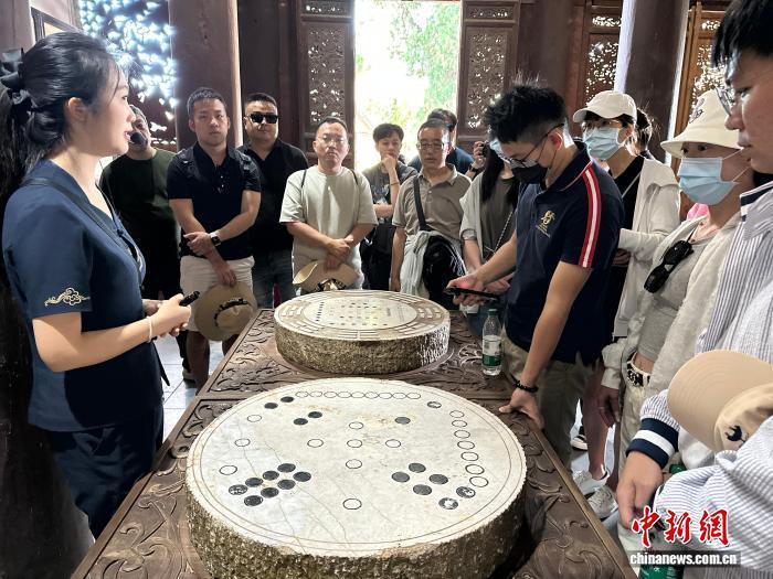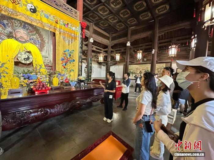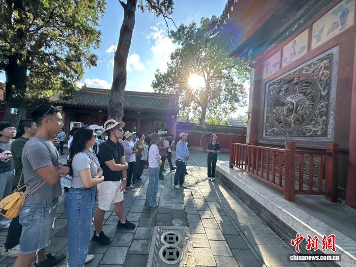 图为台青在伏羲庙先天殿中听取讲解员介绍河图磨盘。王牧雨 摄