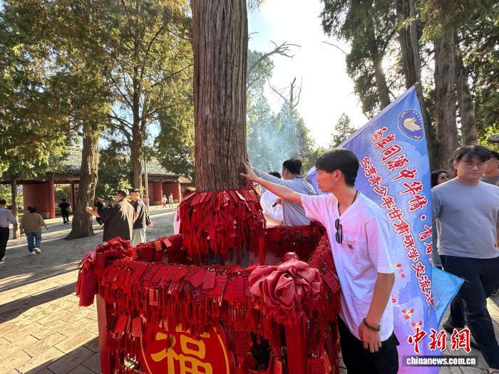 图为台青在伏羲庙中触摸祈福树。王牧雨 摄