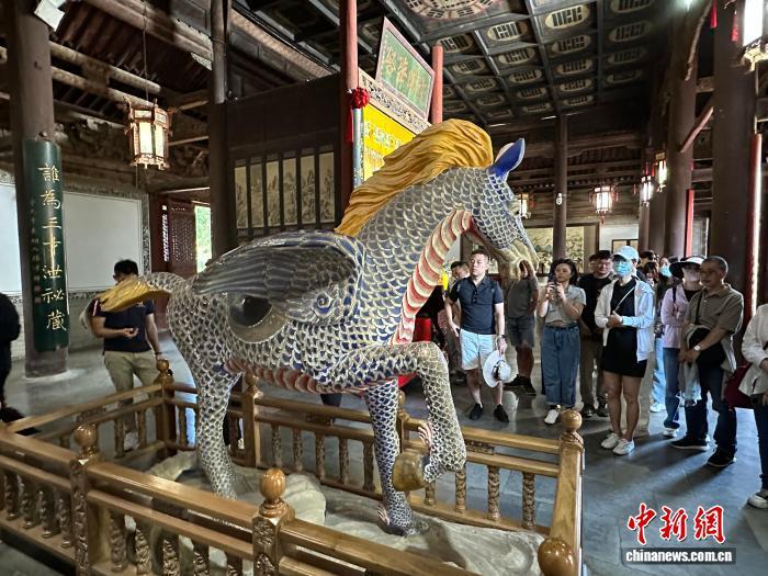 图为台青在伏羲庙先天殿中参观龙马负图雕塑。王牧雨 摄