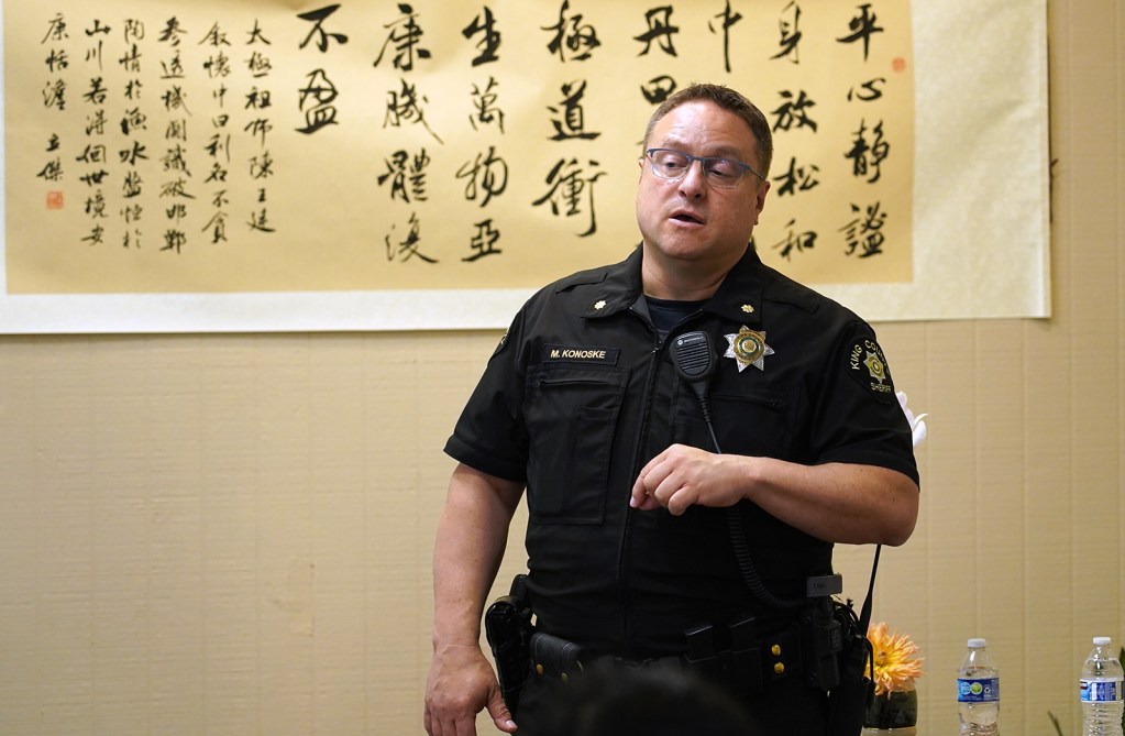 【西雅图中文电台报道,记者Terry】8月30日下午,由中国武术太极学院(Chinese Wushu & Taichi Academy)主办的一场社区安全座谈会在Mercer Island成功举行。活动特别邀请了金县警长办公室(King County Sheriff’s Office)的科诺斯克少校(Major Mark Konoske)到场,为华人社区居民讲解美国地方警察系统的基本知识,并分享日常生活中切实可行的社区安全常识。