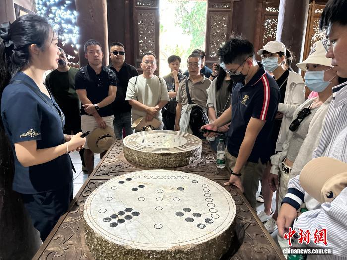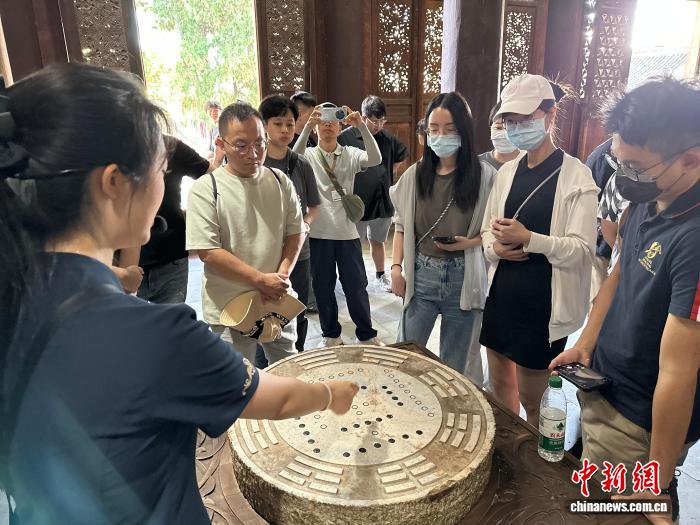 图为台青在伏羲庙先天殿中听取讲解员介绍河图磨盘。王牧雨 摄