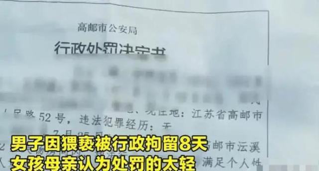 女孩父母报了警,“干爹”因为猥xie被判8天拘留处罚。不少网友认为,处罚太轻了。