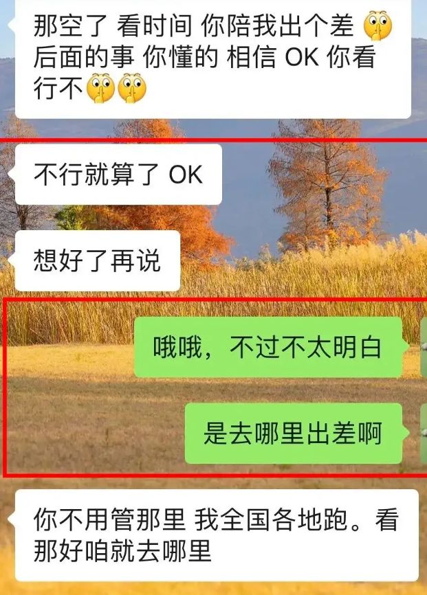 在王女士询问是去哪里出差时,他的回复是:“你不用管去哪里,我全国各地跑,看哪好,咱就去哪里。”