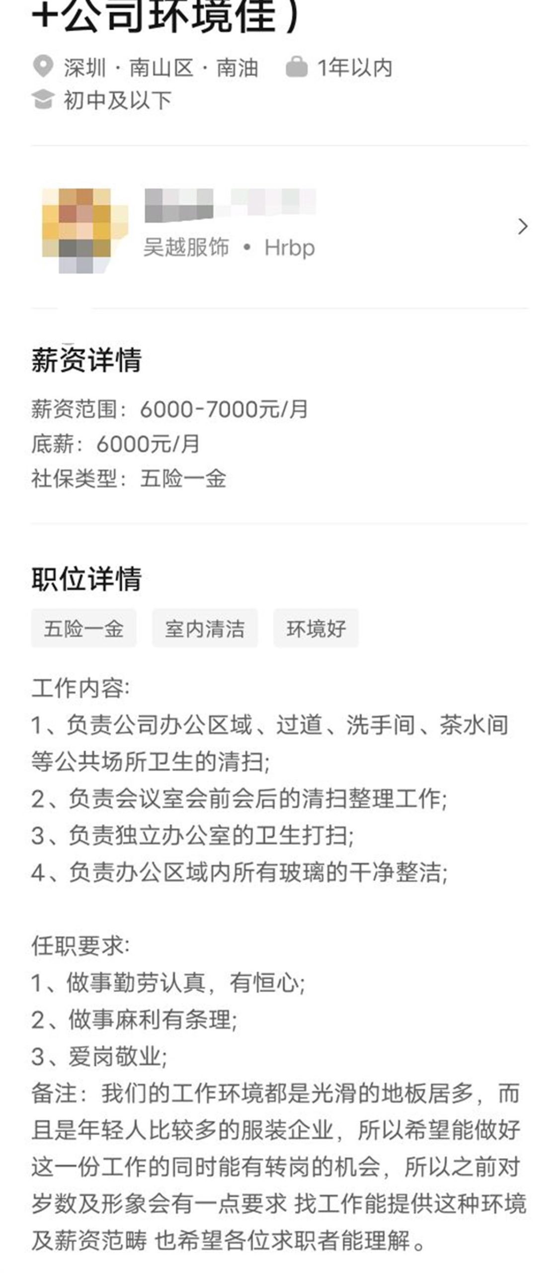 3月13日,一名网友在社交平台发帖称,其在帮亲戚找工作的过程中,看到了一家深圳市南山区服装公司的招聘信息。该公司的招聘职位为保洁员,岗位底薪为每月6000元。任职要求中,保洁员除了爱岗敬业、做事麻利有条理、认真细心外,还要求应聘者形象较好,30岁以内优先考虑。