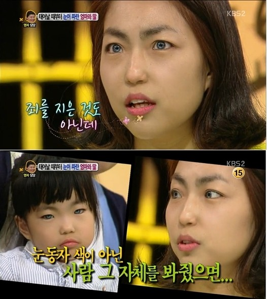 韩国这方面还有类似的节目,一对母女因为天生缺少黑色素,所以眼睛是蓝色的。要是在中国估计很多人就觉得真好看,真漂亮。但是韩国不是这样,韩国人反而特别歧视这两人,他们攻击这对母女为”蓝眼怪物“”怪胎眼“。