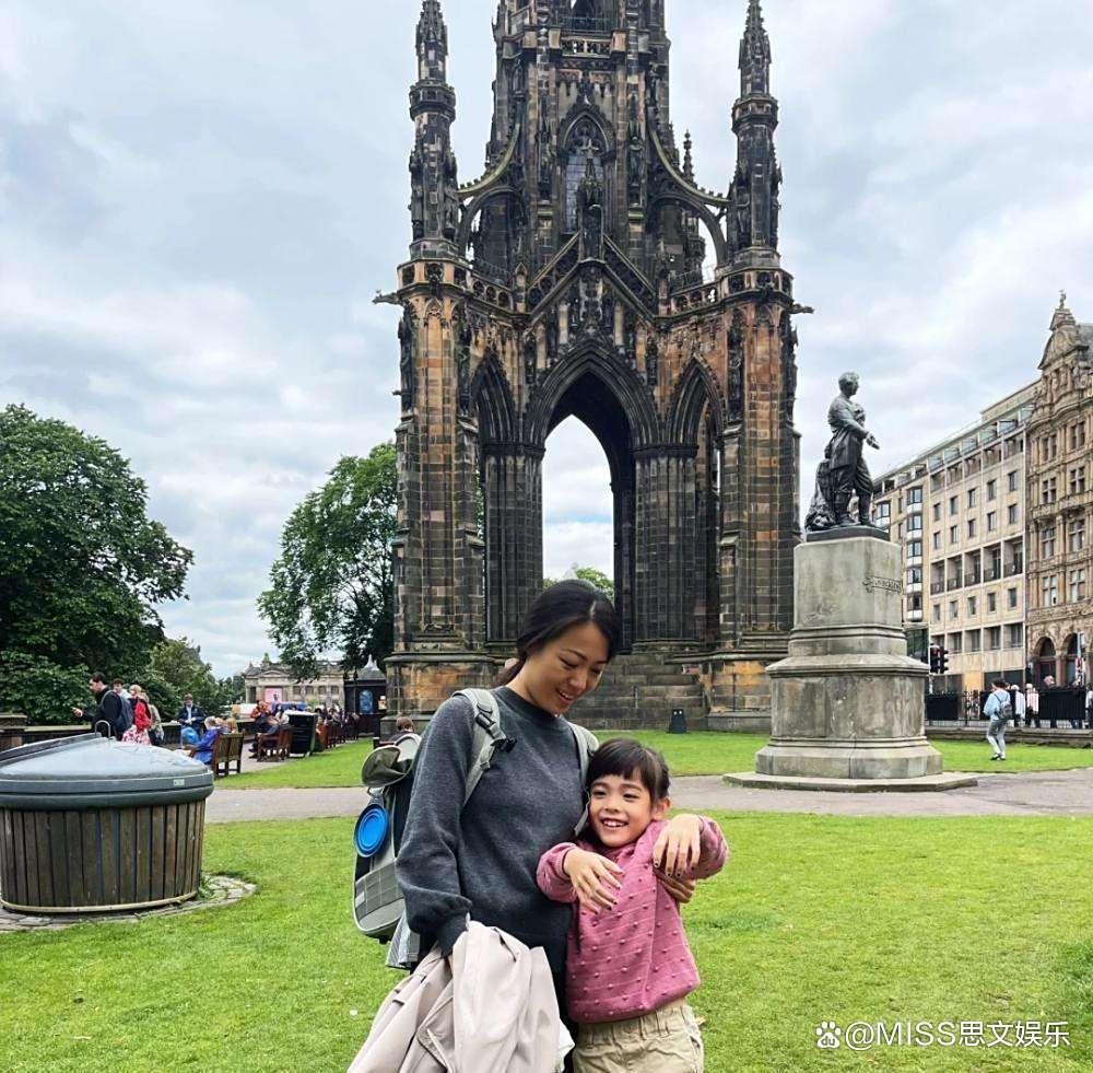 T恤休闲裤加皮鞋,他搂着穿格子裙的小女儿。那种亲密不表演,就是父亲的手臂该在的位置。