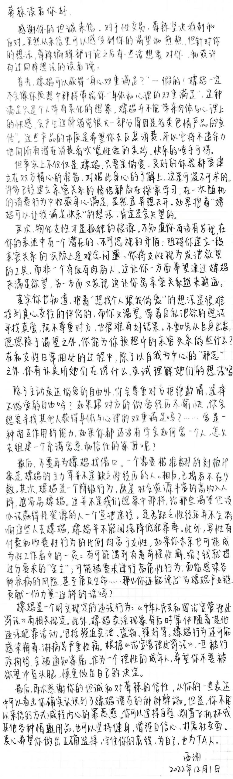感谢你的坦诚来信。要说明的是,对于性交易,莓辣坚决抵制和反对!