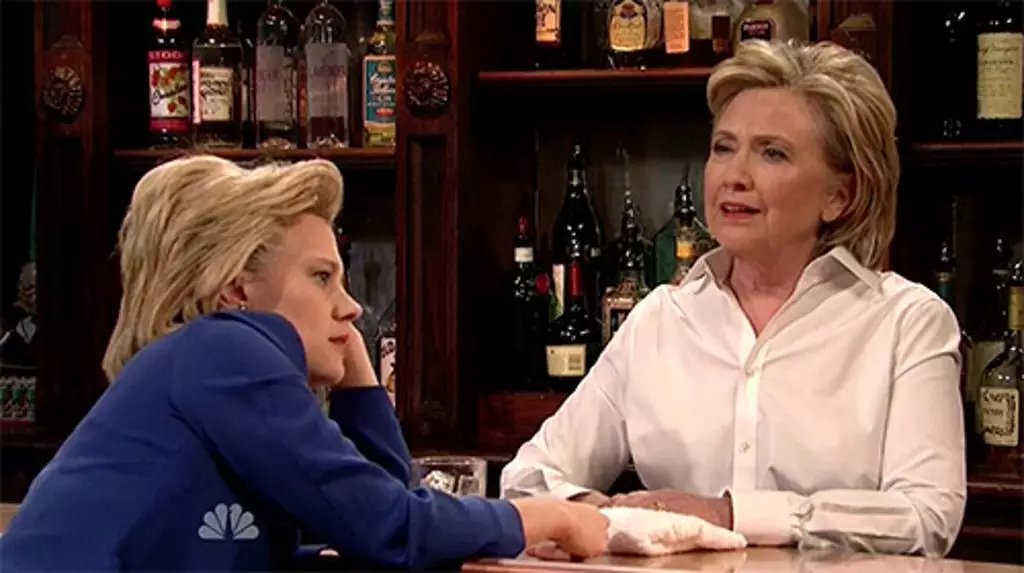 真人希拉里饰演酒保,与剧中买醉的希拉里谈心。