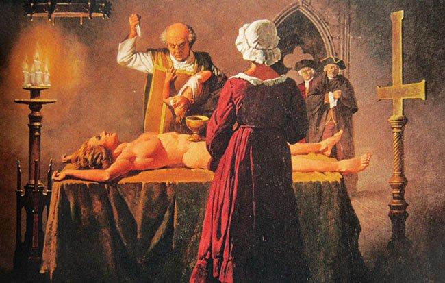 黑弥撒,顾名思义,也是属于弥撒的一种,也需要牧师主持,当然这里的“牧师”必须是还俗的神职人员,且他需要与天主教信仰完全剥离。祭台上是一位赤身裸体的年轻女性,她应当就是求祷之人,她胸前摆着一只十字架,手持两只黑色蜡烛,腹部则摆着一个圣杯,圣杯中盛放的显然不是葡萄酒,而是妓女的尿液或是新鲜的婴儿血,而这一切的目的便是召唤邪灵,从而达到某些邪恶的目的。