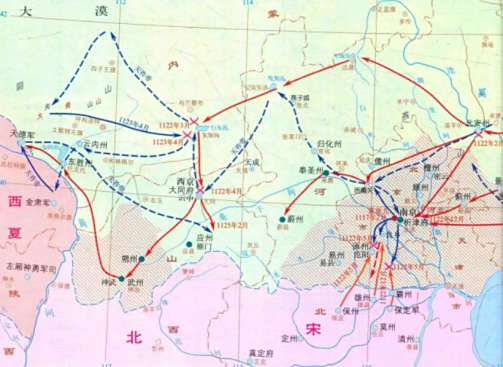 由于战场上消息不通,辽朝内部又以为天祚帝在前线阵亡或被围,于是在南京立耶律淳为皇帝, [58]改元建福,史称“北辽”,天祚帝耶律延禧被降为湘阴王。北辽政权占据了燕、云、平及上京、辽西六路。耶律延禧占据的地区,只有沙漠以北,西南、西北路两都招讨府、诸蕃部族而已。 [59]而辽朝的大臣也各不自保,有的与北宋大臣童贯通气打算投降宋朝的,有的则想投降金朝。四月,西南面招讨使耶律佛顶降金,云内、宁边、东胜等州都投降金朝。西京之战后,沙漠以南的部族都投降金朝。于是耶律延禧逃亡讹莎烈。 [60]六月,耶律延禧传檄天德、云内、朔、武、应、蔚等州,合并诸蕃精兵五万,相约到八月进入南京。并遣人到南京索取衣裘、茗药等物。耶律淳听闻后命南、北面大臣商议如何处置。不久,耶律淳病死。众臣商议立其妻萧普贤女为皇太后,主持军国大事,并奉遗命迎立天祚帝的第五子秦王耶律定为帝,太后称制,改元德兴。 [61]十一月,居庸关失守;十二月,南京被攻破。 [62]