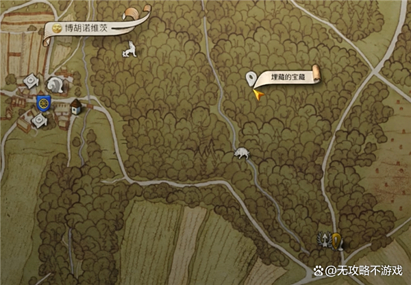 根据你从藏宝图上获得的线索,前往波胡诺维茨右侧的树林。在这片树林中,有一棵特别显眼的树。根据提示,在这棵树下挖掘,你将能够获得宝藏。要小心,树下可能藏有一些危险,务必保持警惕。