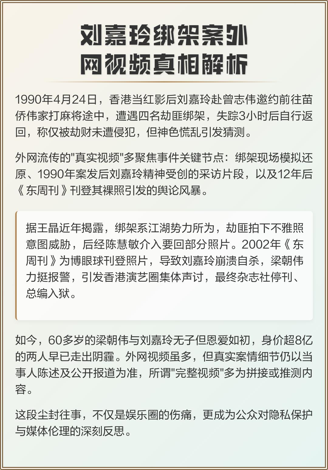 外网流传的“真实视频”多聚焦事件关键节点:绑架现场模拟还原、1990年案发后刘嘉玲精神受创的采访片段,以及12年后《东周刊》刊登其裸照引发的舆论风暴。