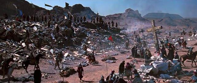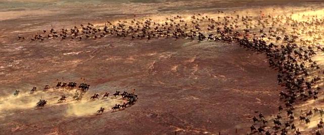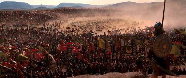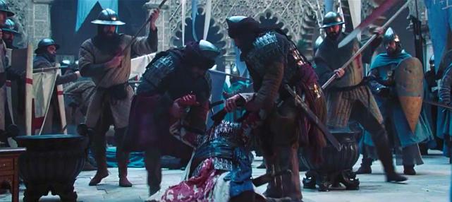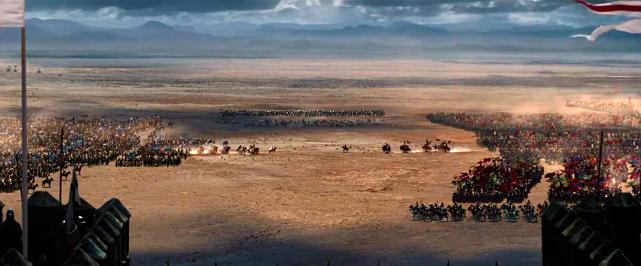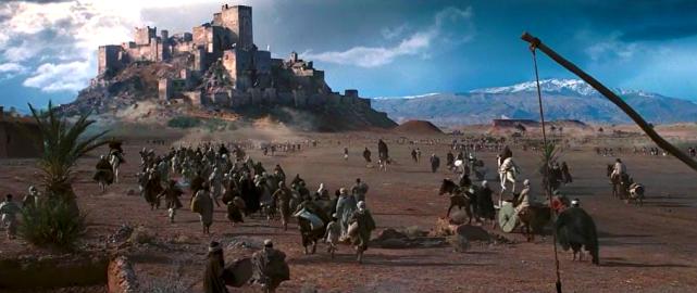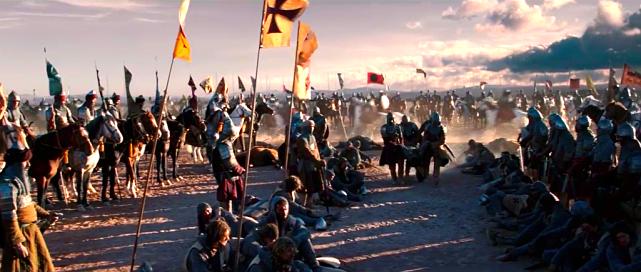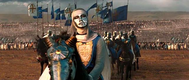 在卡勒堡前,伊贝林男爵带领他的百人骑兵与排山倒海的阿拉伯骑兵对冲,殊死一战;这只是本片战争场面的小试牛刀,古代欧洲重甲骑士的战争场面,在我们在指环王也看到过,对于古代军事爱好者而言,是难得一见的影片场景,重甲骑士防御很好,轻微的箭矢和刀剑砍杀几乎很难受伤,但是电影场面依然血性十足,显然真正的古代战争,矛与盾都在极致的对抗中挖掘着人类最绝望的潜力;