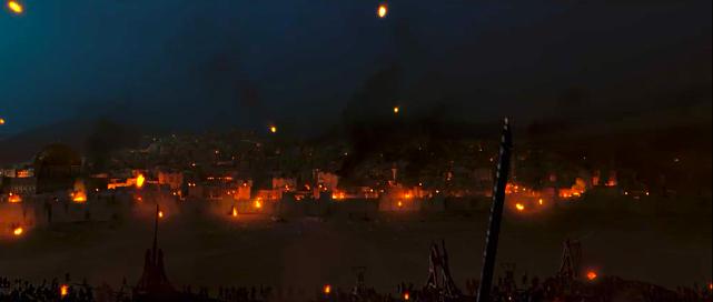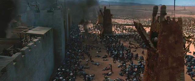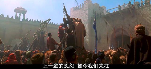 接下来是影片的高潮部分,浩瀚的攻城大战,投石机,攻城高架车,你来我往;没必要赘叙,希望大家自己用感官体会;战争白天达到黑夜,黑夜达到白天,萨拉丁大军每天定时朝拜完,接着攻城一刻也不停息;由于之前耶路撒冷王接受了伊贝林男爵关于城墙防御工事的改造,在这次防御战起到了奇效,萨拉丁的攻城器械全部失效,最终之后轰击旧的城门附近围墙,打开缺口,双放在这个小狭口处展开了肉搏;