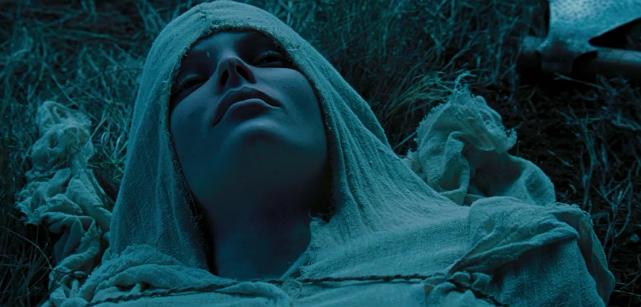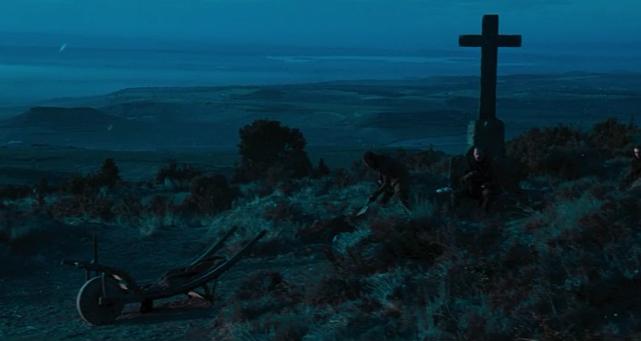 影片开始在一个阴冷飘雪的早晨,远处寒鸦啼鸣,在一个立着十字架的十字路口有两个掘墓人,其中一个叫格拉弗蒂格,请记住这个名字,这段镜头暗喻中世纪欧洲黑暗的统治,人们生活困苦麻木;镜头切到一个神父,他是男主铁匠的哥哥,我们叫他坏神父,他回头看了一眼远处的城堡,掰开了手中的腐烂的苹果剔除了一条蛆虫,男主铁匠的妻子由于丧子悲伤自杀,这在当时基督教属于禁忌,由于坏神父是男主的哥哥,担心这件事会影响他日后成为主教的绊脚石,于是首当其冲带着人要把男主的妻子埋葬在十字路口,并斩首羞辱,接受万人的踩踏,远处的城堡代表他觊觎的权利,腐败的苹果是堕落的基督统治,那条蛆虫对于他来说是这具尸体,对于导演来说,其实是他;之后坏神父与格拉弗蒂格进行了一场关于逻辑与公平的辩论,坏神父刚咒骂格拉弗蒂格热爱盗窃,转眼他偷走了铁匠妻子尸体身上的黄金十字架;