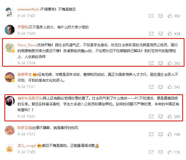 A网友:网上还有舆论觉得处理的重了。社会风气到了什么地步——PC不仅违法,更是道德品质的沦丧。复旦这样著名高校,学生大多进入公务员和事业单位。这样的问题不严肃处理,未来的中国还有希望吗??