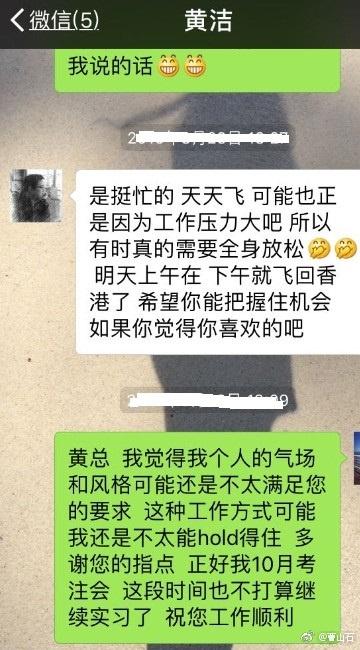 这次这个女实习生爆出的中金分析师黄洁欲潜规则她的事件,可以看的出来,黄洁应该已经是老江湖了,之前应该得手过数次,这样的潜规则暗示,如果是放在别的实习生那里,也许就会沦陷了,因为黄洁在圈子内还是比较有声望的,就跟演艺圈的大导演一样,刚毕业进入社会的实习生遇到黄洁,就跟小演员遇到知名导演一样,想要坚守原则抗拒诱惑本来就是一件很困难的事,不要小看这种诱惑的魔力,如果一时的付出换来的是未来的职业转变、年收入过百万,我想很少有人是真的能坚决抗拒的。