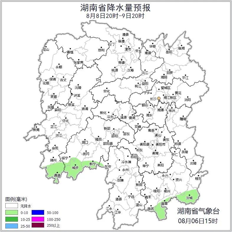 8月7日白天,多云有小到中等阵雨或雷阵雨,其中怀化南部、邵阳南部、永州南部、郴州南部、常德中部、益阳中部大雨,怀化(通道)、邵阳(绥宁、城步)、永州(江华、蓝山)、郴州(临武、宜章)暴雨;南风2~3级,雷雨时局地阵风7~8级;最高气温湘西湘北34~36℃,其他地区29~32℃,最低气温24~27℃。