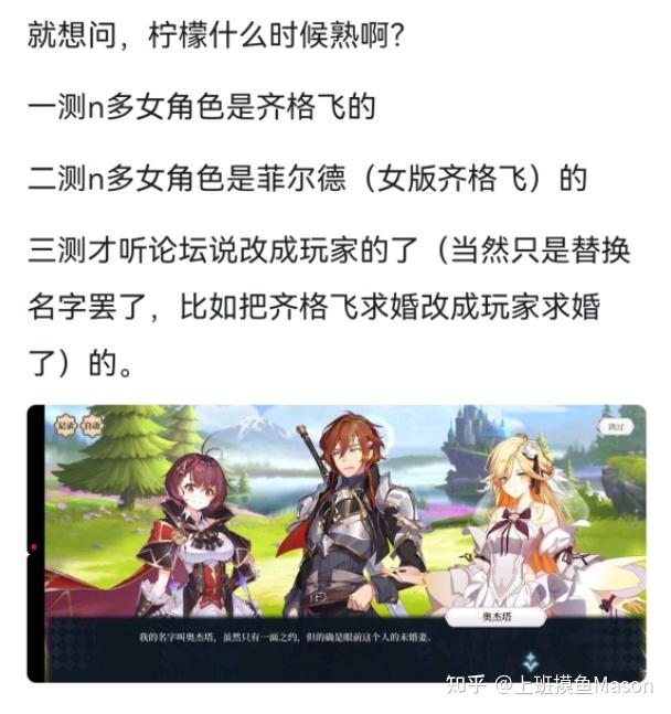 然后这个游戏官方的操作也是走路带刀骚到闪腰,一测因为剧情让玩家帮其他男人养老婆被喷爆,于是二测就修改成了让玩家帮其他女人养老婆?然后又被喷爆,最后现在直接改回了一测的剧情,但是非常聪明的把在一测中玩家帮着追妹子的男人“齐格飞”的名字简单的替换成了玩家自己的名字。