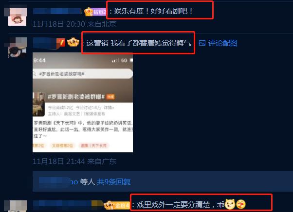 对此,网友们也是议论纷纷,评论区更是一片倒。都支持罗晋的说法,娱乐有度,面对作品,背对生活。还表示《天下长河》是部优秀作品,值得更好地宣传。也有的忍不住吐槽宣传不好好带词条,不会宣传就滚远点,看到都快气死了。