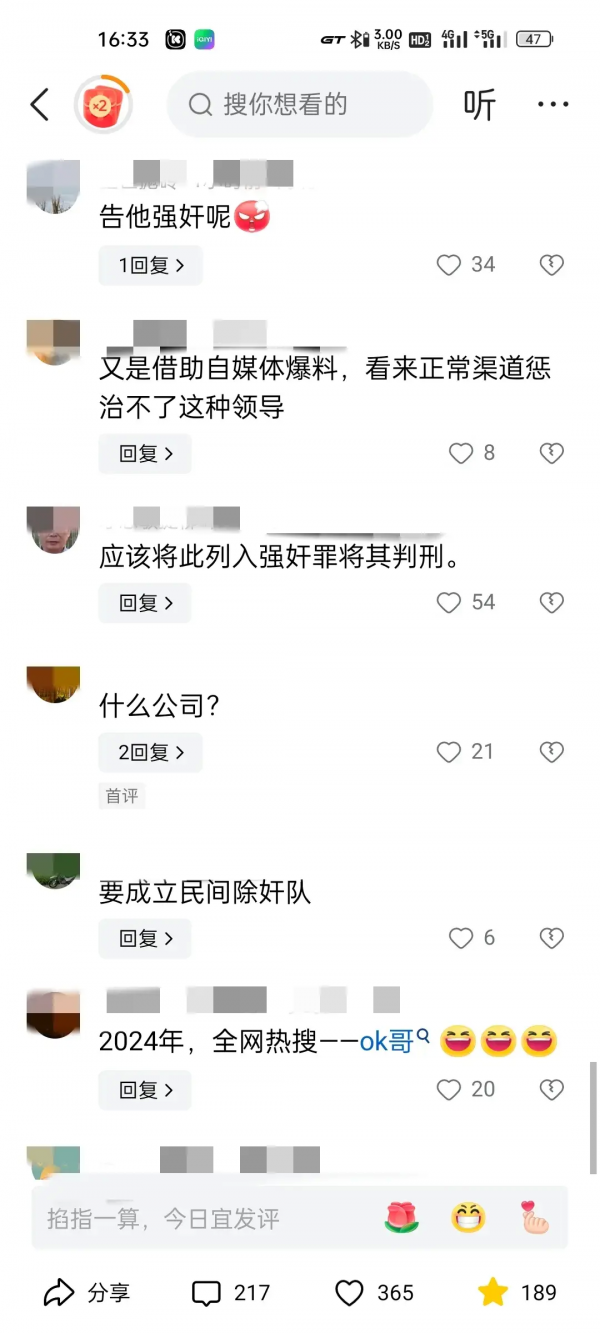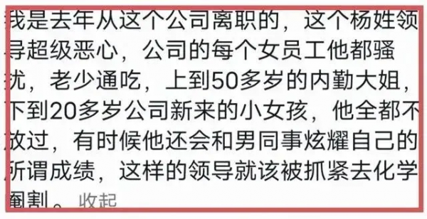 在女员工明确拒绝后,杨某态度嚣张,不仅威胁其离职,还将其移出工作群。此后,又有网友爆料该公司其他女同事也遭受了类似的潜规则,包括因潜规则导致的离婚。