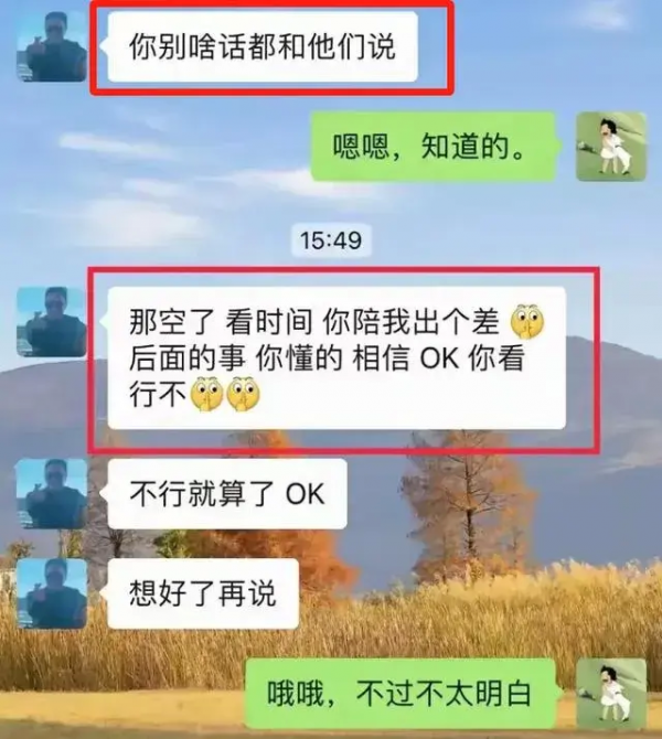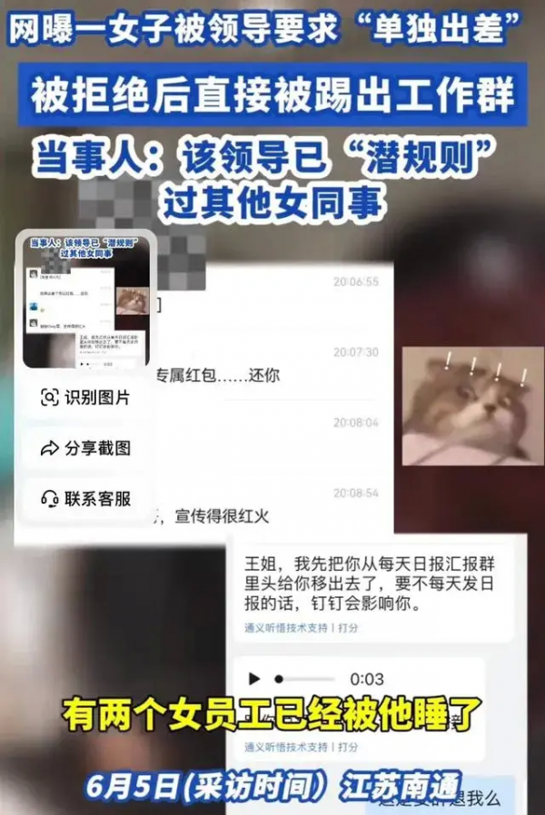 一名女员工在工作中遭遇潜规则,经过了聊天记录的曝光,显示领导杨某的不当行为。