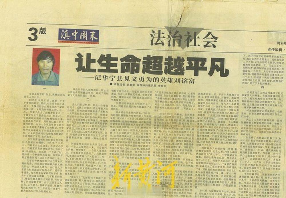 2003年5月24日,云南当地媒体曾在报纸发表题为《让生命超越平凡——记华宁县见义勇为的英雄刘铭富》一文。文中称,刘铭富平素在村里就以好打抱不平、爱管闲事著称。每当村里有家庭在闹矛盾,都少不了他去调解,为了村里的安宁,他也乐意去做这方面的事,及时化解了许多家庭矛盾。由于其为人正直,乐于助人,遇事不推诿,赢得村民们的信任,被大家选为村民小组副组长。