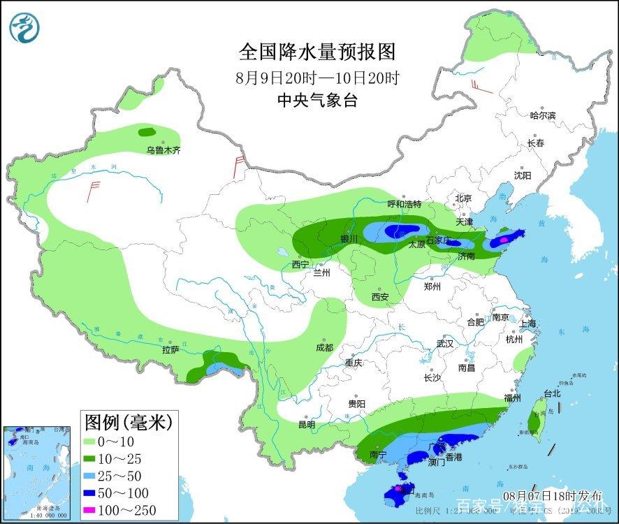 8月9日20时至10日20时,内蒙古西部、西藏东南部、甘肃河西、陕西中北部、山西中北部、河北中南部、山东中北部以及华南大部、台湾岛等地的部分地区有中到大雨,其中,陕西中北部、山西中北部、河北东南部、山东北部、广东南部沿海、海南岛大部等地的部分地区有暴雨或大暴雨(100~130毫米)。新疆南疆盆地和东部、内蒙古东北部等地部分地区有4~6级风;南海大部海域有6~8级,阵风9~10级风