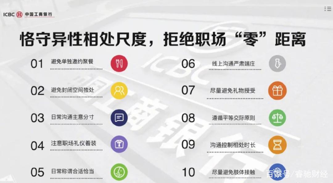 为改善行业整体形象,很多公司都出台过相关规定。例如此前,工商银行曾发布《恪守异性相处尺度 拒绝职场“零”距离》的倡议书,详细提示了什么行为不能做如男同事给女同事送吊带睡衣;男同事给女同事发“有空一起睡觉”表情包;女同事试穿胸罩问男同事“好看吗”;女同事让男同事给拉背后拉链等等。也有网友评价,工商银行的这种要求,未免“矫枉过正”。