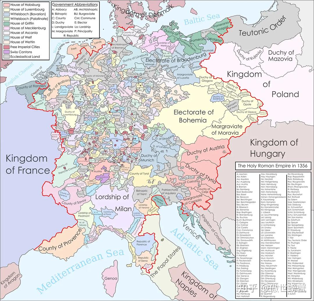 左侧有法兰西王国,右侧与波西米亚地区邻近的区域则非常复杂,波兰,匈牙利虎视眈眈的同时。