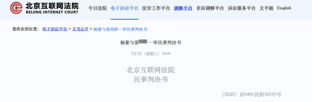 北京互联网法院判决,雷某妍赔偿杨紫精神损害抚慰金和合理支出共计2万元;并连续七日在其微博账号上登致歉声明,向杨紫公开道歉。