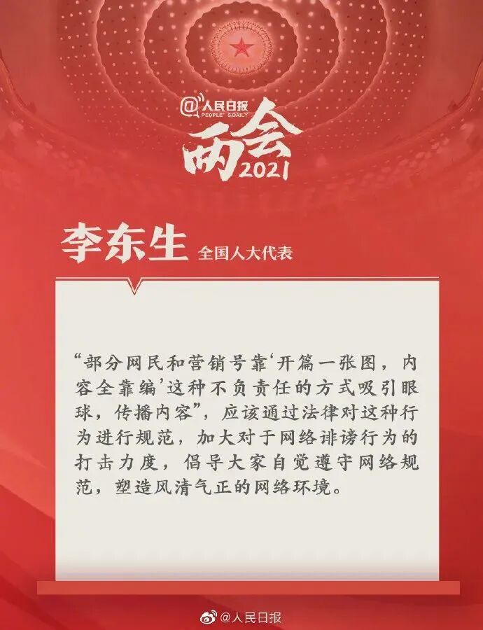 针对类似情况,全国人大代表李东生认为,部分营销号靠不负责任的方式吸引眼球,传播内容,应该通过法律对这种行为进行规范。李东生建议:通过立法明确其他社会主体的责任,比如加大网络平台实名制管理;对“流量”至上的广告投放模式进行规范和引导;提升营销号的诽谤成本等,鼓励公民正当维权。