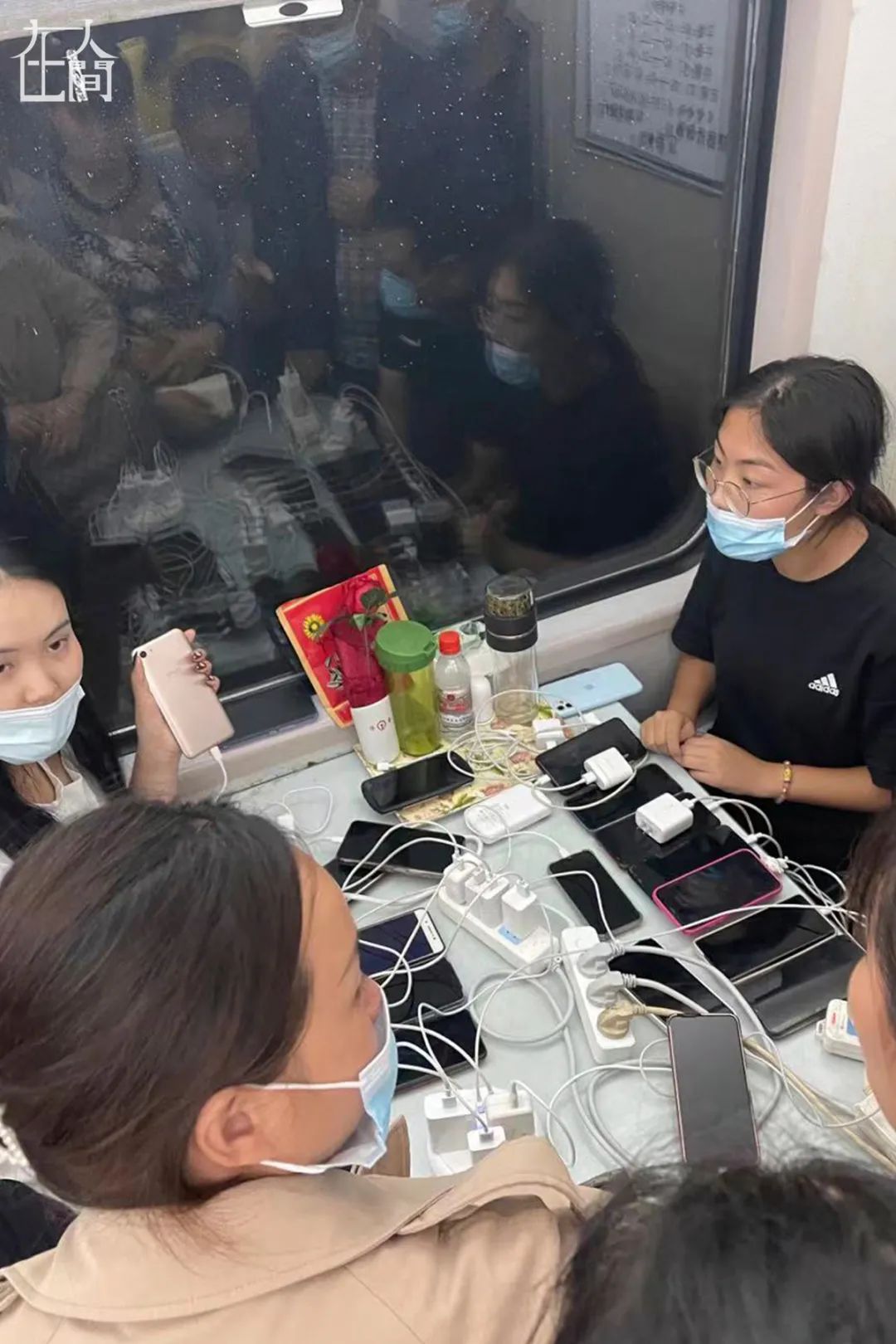车上秩序还行,只是大家的情绪都很不好,有的人手机没电所以联系不上家人、朋友。我的车程是3小时50分钟,硬座没票我就买了软卧,四个人一个房间,轮着充电也刚好够用。硬座那边人很多,插座不够用,充电很不方便,大家都托人把手机拿到餐车充电,餐桌上都是交织在一起的数据线、十几个手机和充电宝。白天我们也只能靠睡觉打发时间,玩手机还要想着省点儿电。