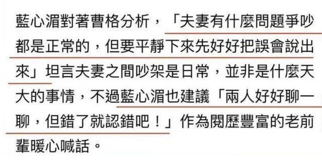 面对曹格的暴走怒斥,与外界的关注,蓝心湄正式回应了:夫妻有什么问题争吵是正常的。